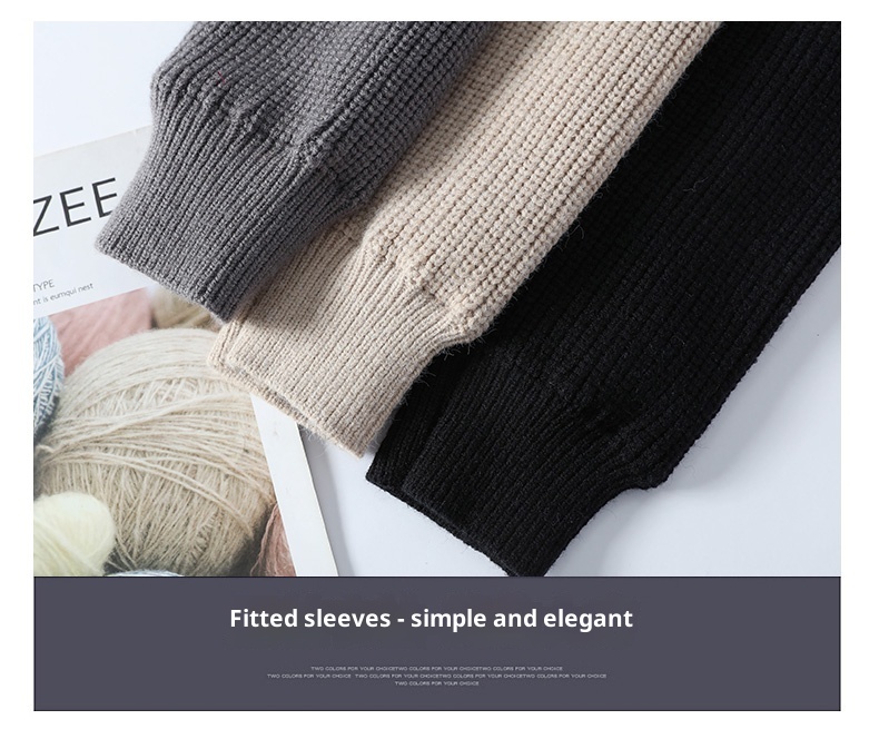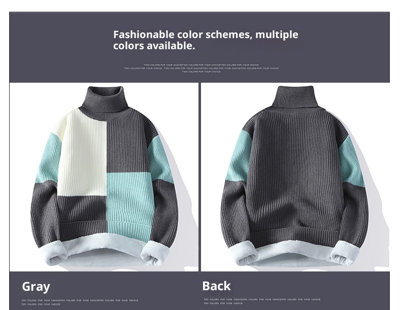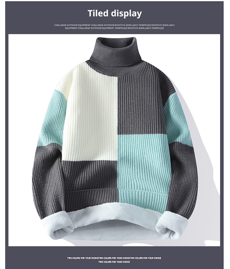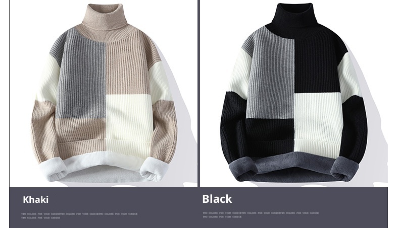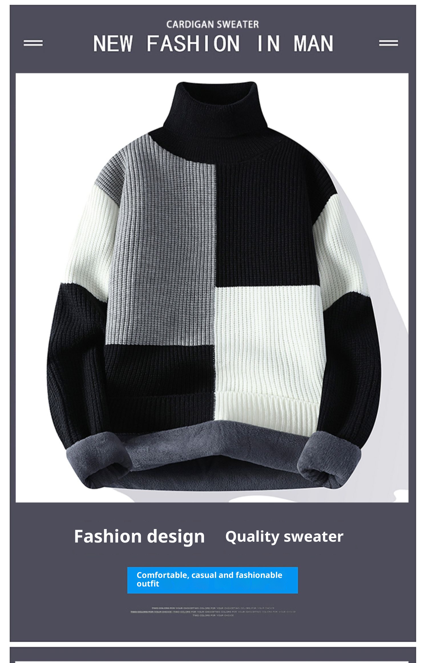 Contrast Color Turtleneck Men's Fleece-lined Knitting Bottoming Loose Sweater