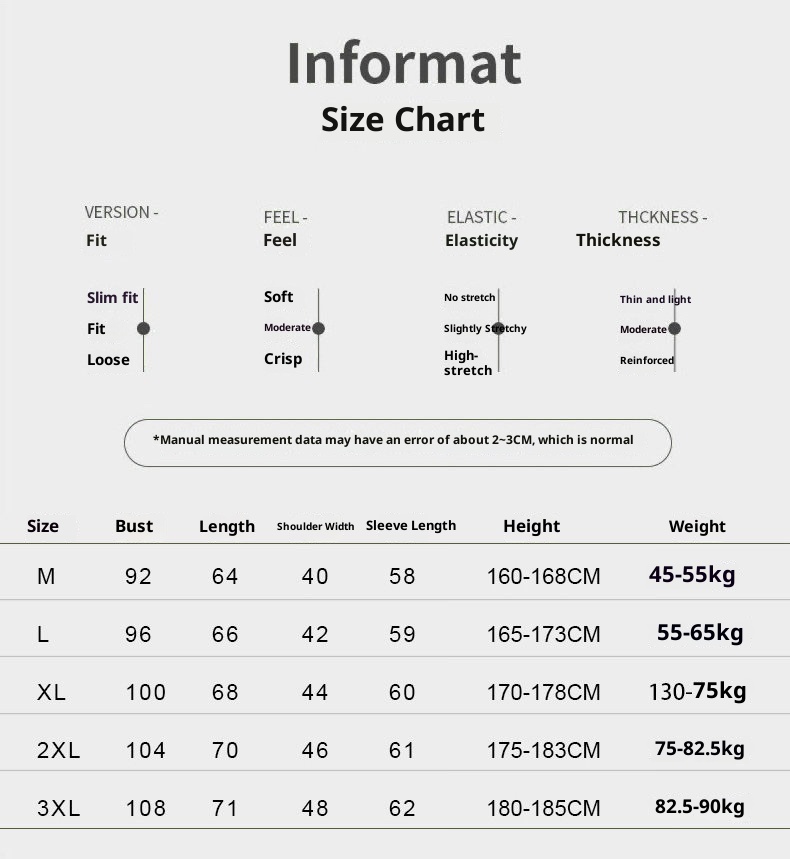 Size: 165 (about 45.00kg wearable),170 (about 55.00kg wearable),175 (about 60.00kg wearable),180 (about 72.50kg wearable),185 (about 77.50kg wearable),190 (about 85.00kg wearable)