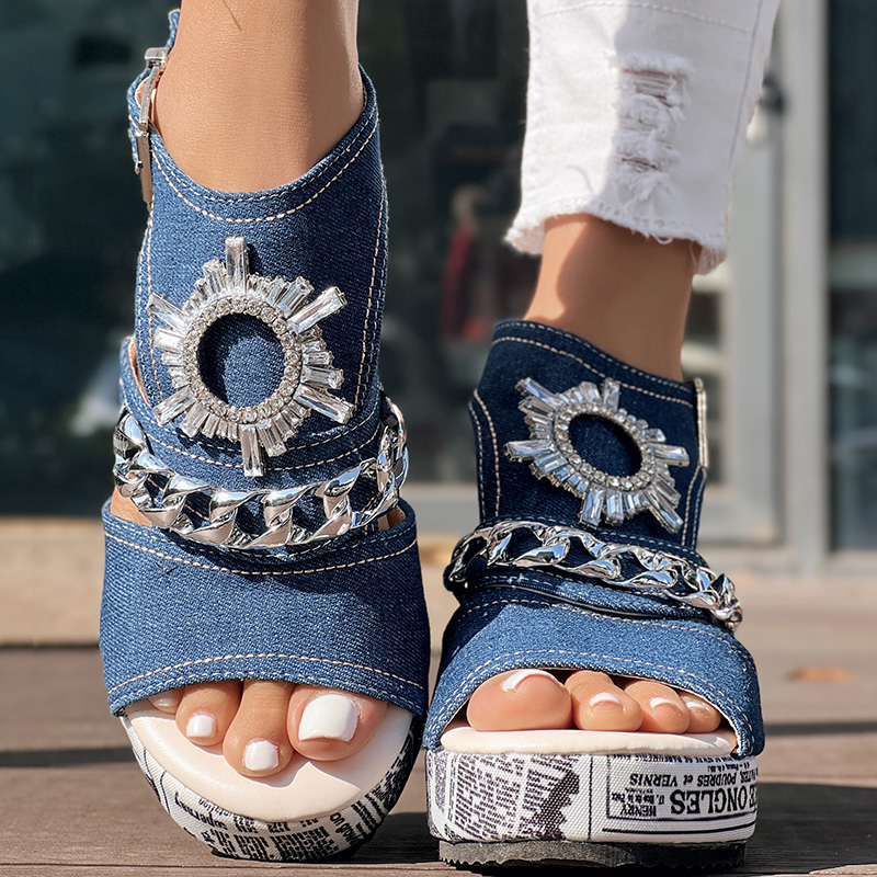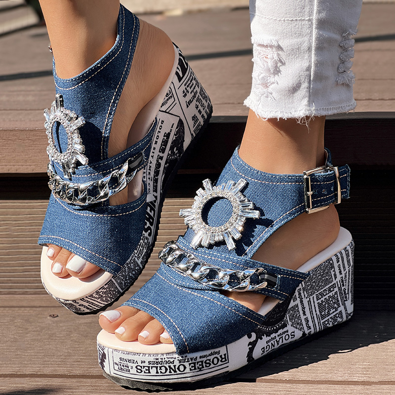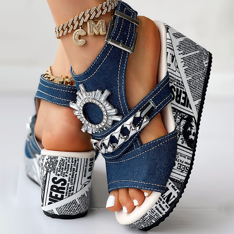 Newspaper Buckle Denim Wedge Slides - Anklet Not Included
