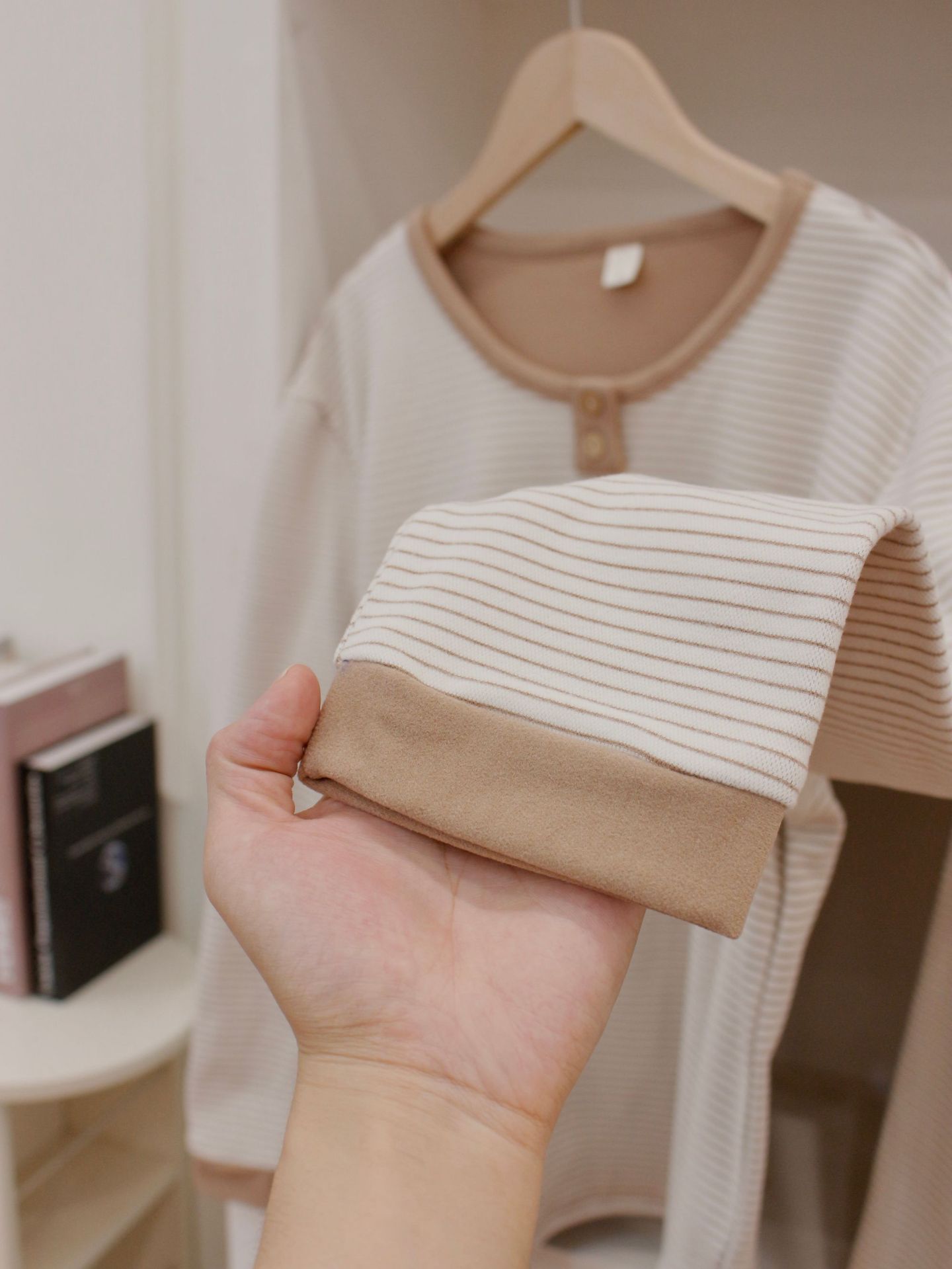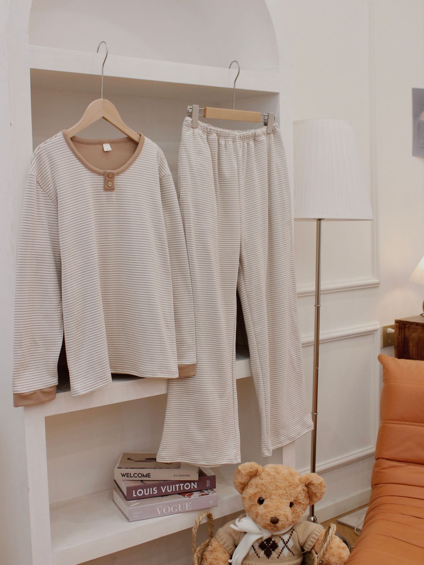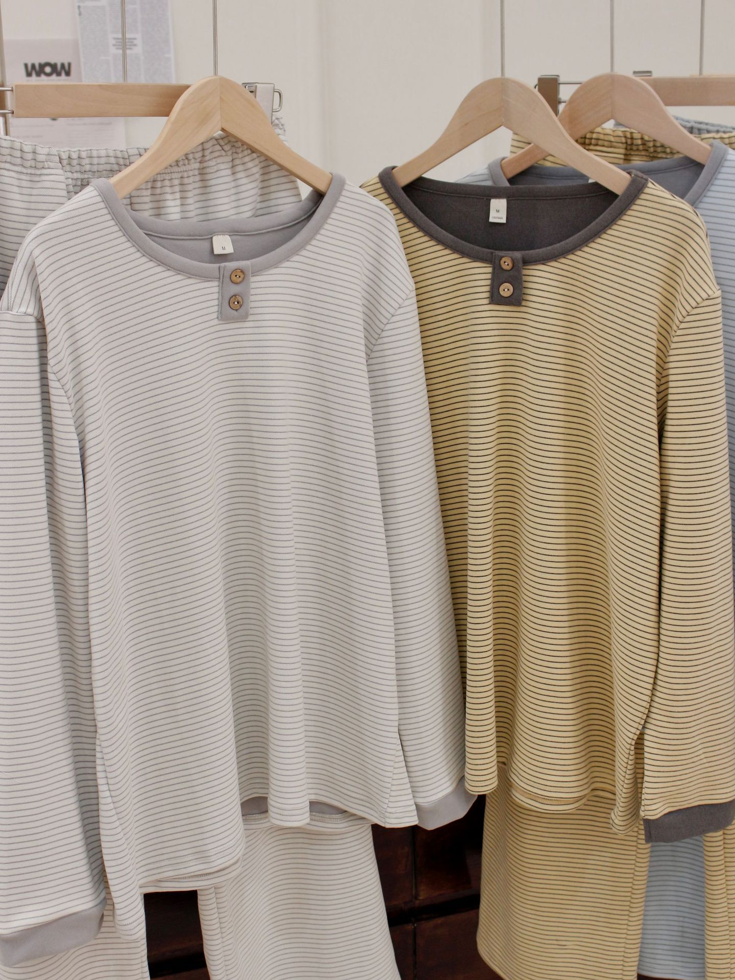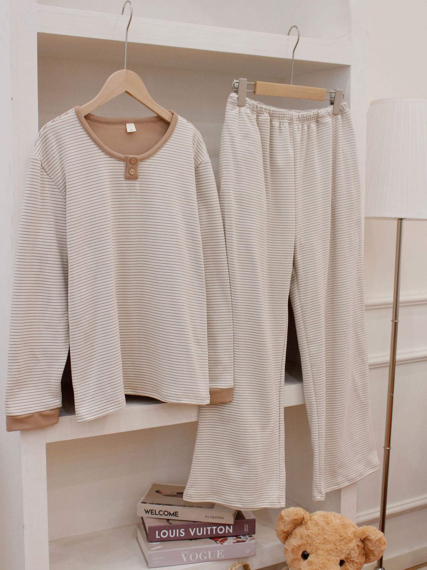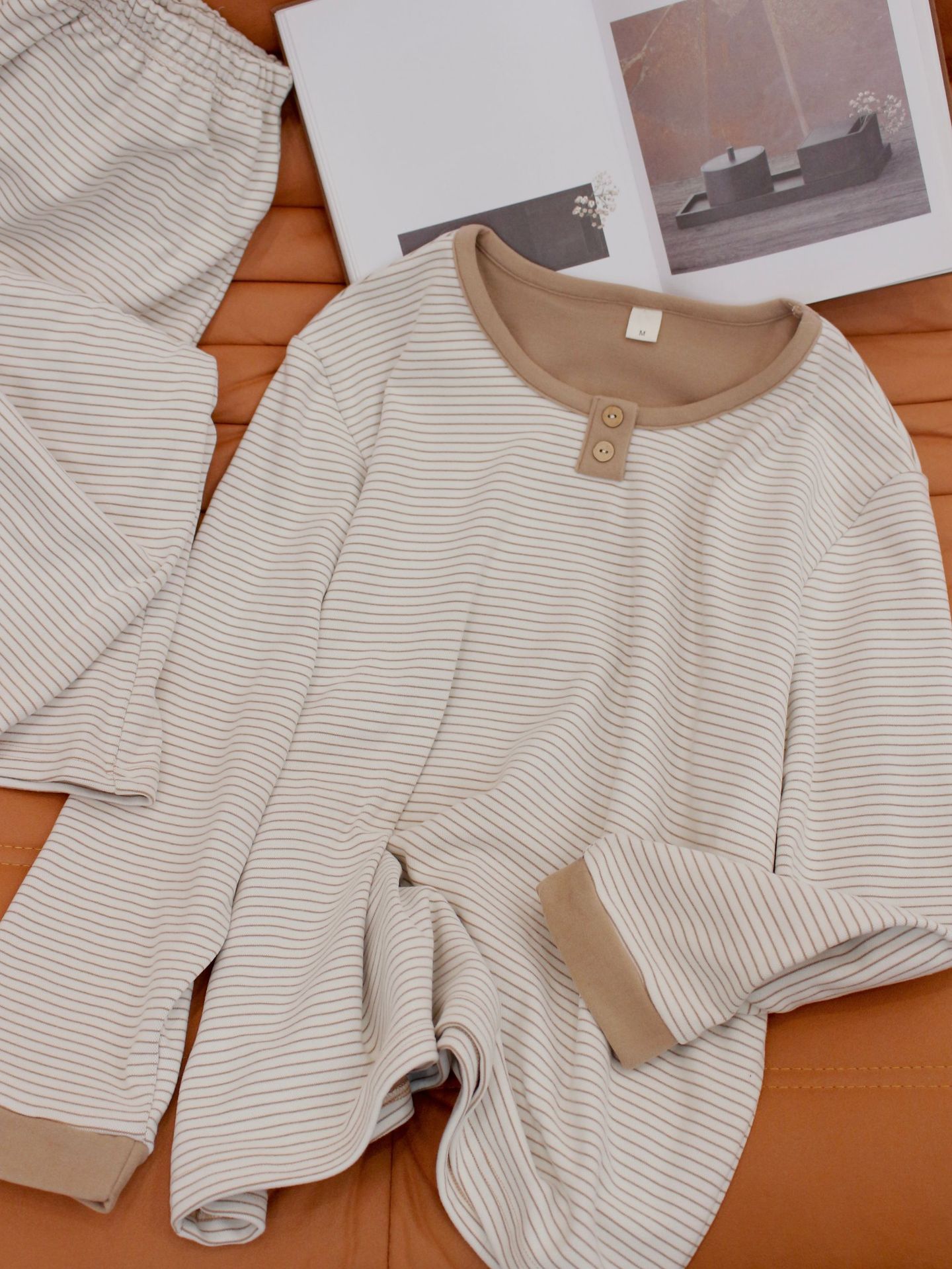 Color: de Velvet women's round neck light blue striped suit, de Velvet women's round neck beige striped suit, de Velvet women's round neck warm brown striped suit, de Velvet women's round neck light gray striped suit, de velvet women's round neck soft pink striped suit, de Velvet women's round neck silver gray striped suit
