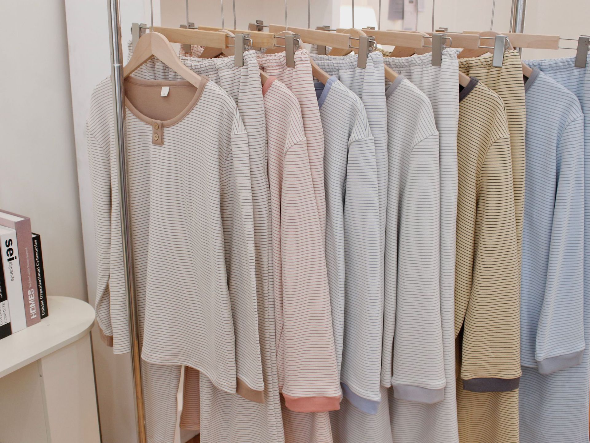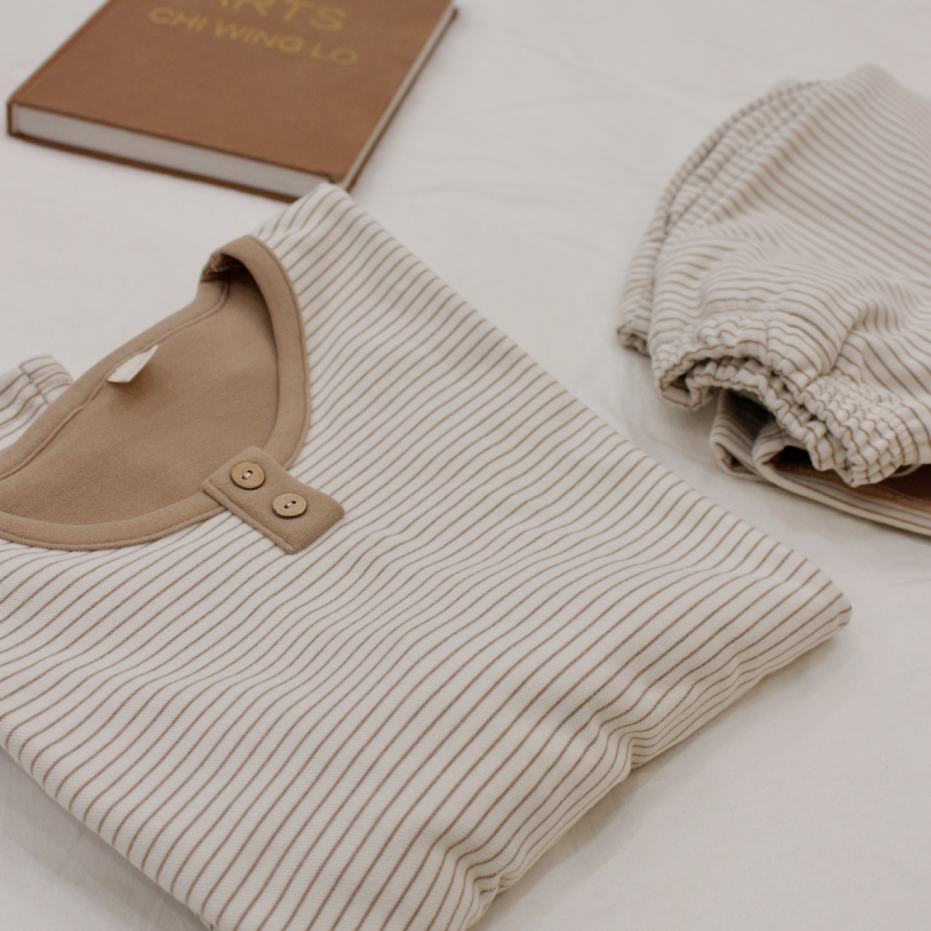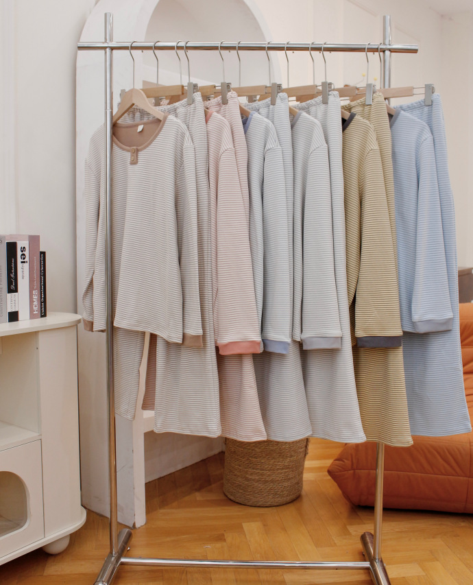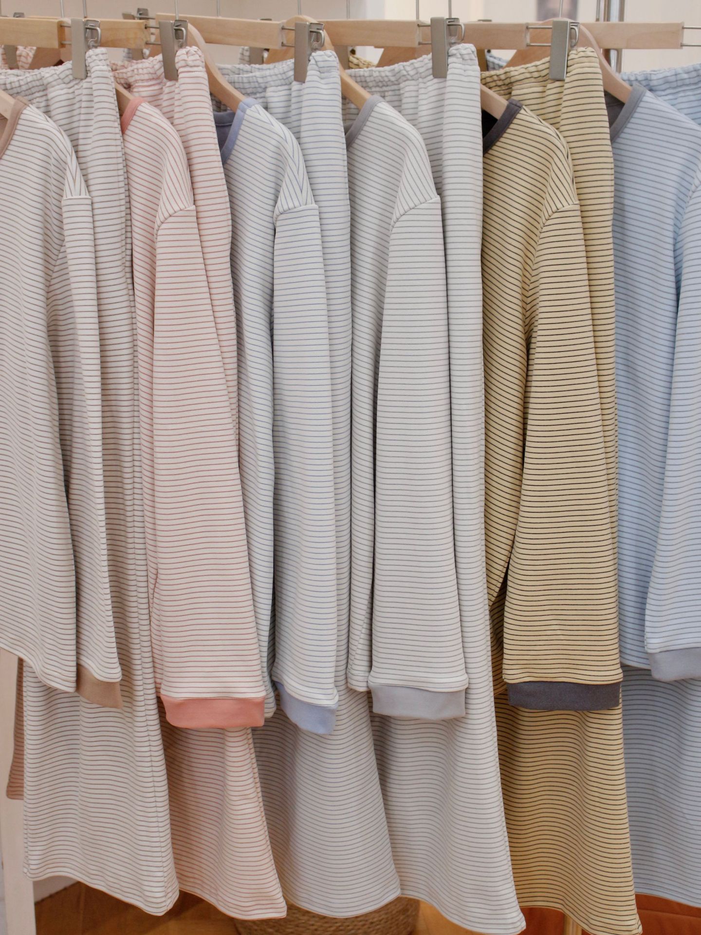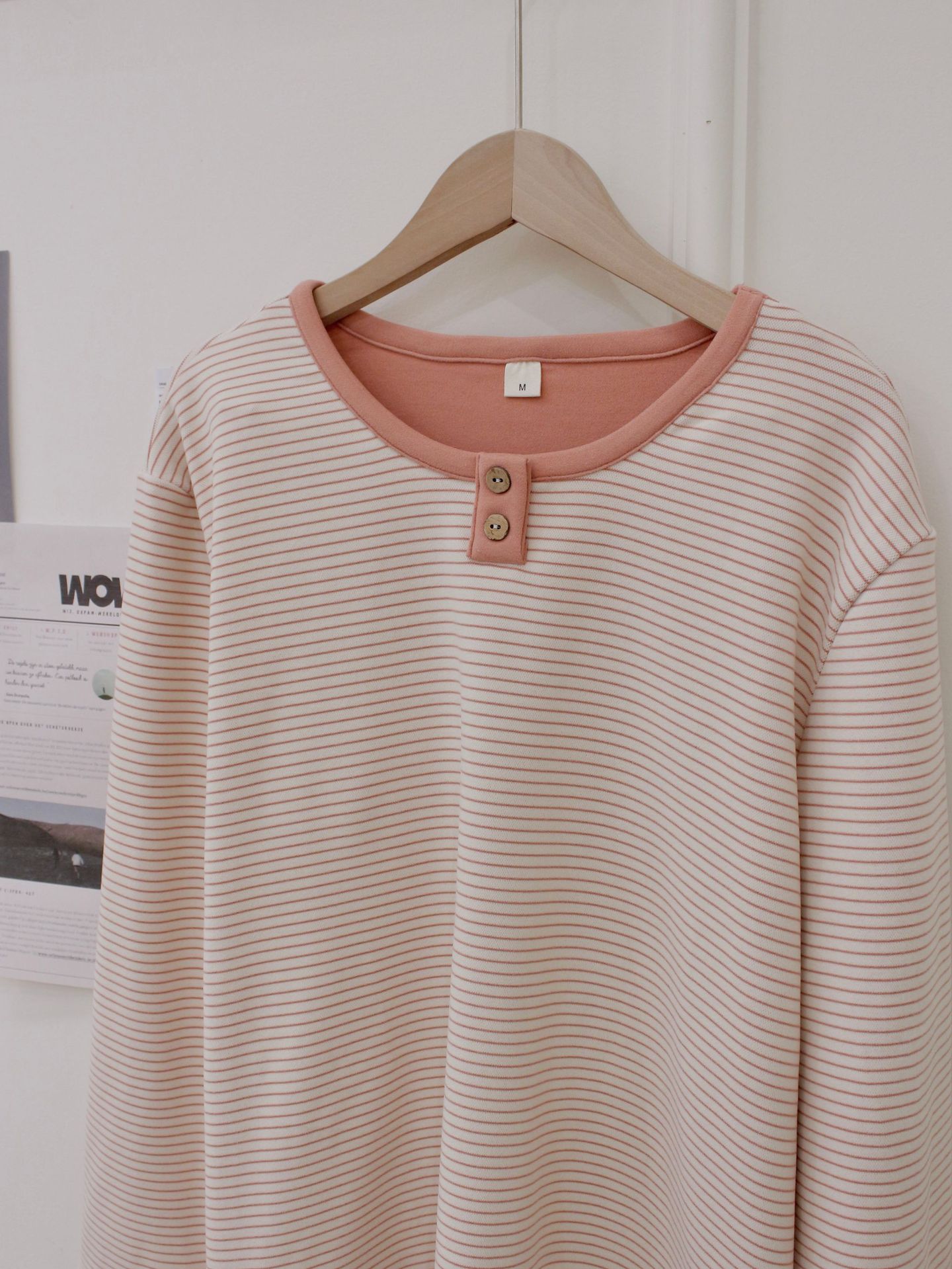 Color: de Velvet women's round neck light blue striped suit, de Velvet women's round neck beige striped suit, de Velvet women's round neck warm brown striped suit, de Velvet women's round neck light gray striped suit, de velvet women's round neck soft pink striped suit, de Velvet women's round neck silver gray striped suit
