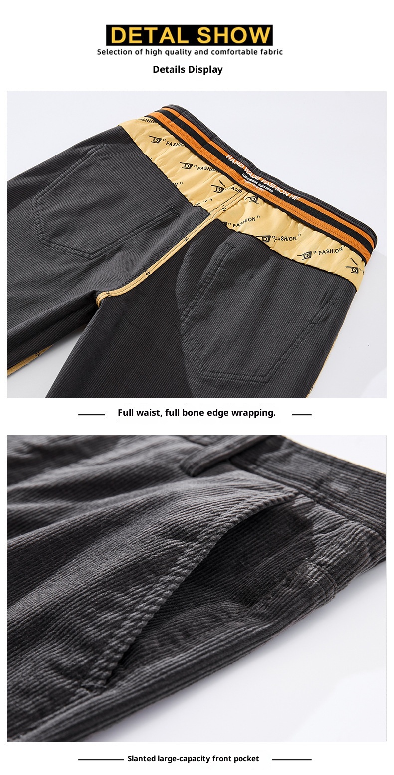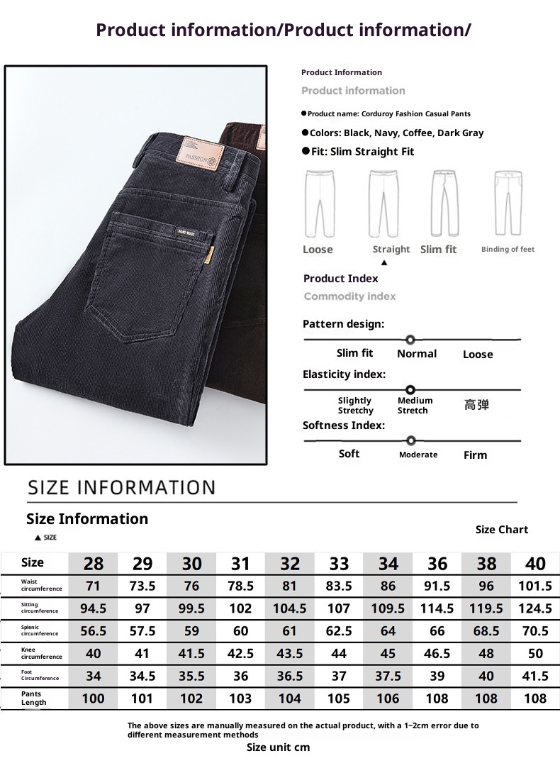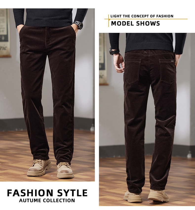 Product information: Color: black, dark gray, navy blue, brown Elasticity: Micro elasticity Waist Type: Mid waist Size: 28, 29, 30, 31, 32, 33, 34, 36, 38, 40 Fabric: corduroy Main...